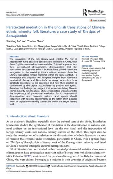 近日,北京理工大学(珠海)布莱恩特项目主任赵友斌教授与其在读博士生符霄婷在世界翻译顶级期刊“Perspectives”(SSCI,A&HCI)发表长篇论文——《中国少数民族民间文学英译中的互文性调解——以<布洛陀经诗〉为例》(Paratextual Mediation in the English Translations of Chinese Ethnic Minority Folk Literature: A Case Study of The Epic of Baeuqloxdoh,共23页); 这是赵友斌教授与其博士生近年来在国际顶级刊物发表的第5篇有影响力的长篇论文。